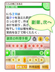 | 下画面には、上から順に「主菜」「副菜」「汁物」の手順の表示を切り替える番号があります。順番にタッチして、上画面に表示される作りかたにしたがって調理しましょう。 3品を同時進行で進められ、お料理の効率UPに! ![]() |