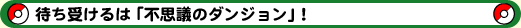 | ポケモンたちを助けるために、あなたとパートナーは、入るたびに地形が変わる「不思議のダンジョン」と呼ばれる場所を冒険していくことになります。ダンジョンの中には、たくさんのポケモンが住んでおり、攻撃を仕掛けてきます。ダンジョン内では、自分が1回行動すると相手のポケモンも1回行動をするという、「ターン制」というルールで進んでいきます。あせって行動すると思わぬピンチを招くこともあります。相手のポケモンの動きをよく考え、様々なわざやどうぐを駆使し、冷静に行動することが、ダンジョン攻略のカギです。 |