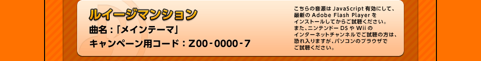「ルイージマンション」 曲名 : 「メインテーマ」 キャンペーン用コード:Z00-0000-7
