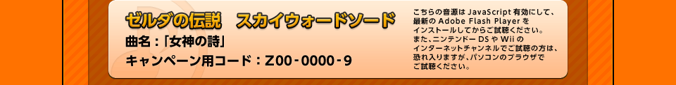 「ゼルダの伝説 スカイウォードソード」曲名 : 「女神の詩」キャンペーン用コード:Z00-0000-9