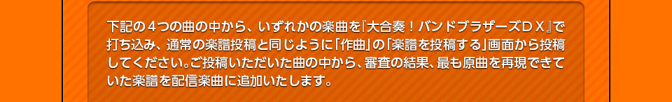 下記の4つの曲の中から、いずれかの楽曲を『大合奏!バンドブラザーズDX』で打ち込み、通常の楽譜投稿と同じように「作曲」の「楽譜を投稿する」画面から投稿してください。ご投稿いただいた曲の中から、審査の結果、最も原曲を再現できていた楽譜を配信楽曲に追加いたします。