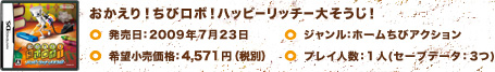 おかえり!ちびロボ!ハッピーリッチー大そうじ! ○発売日:2009年7月23日 ○希望小売価格:4,571円(税別) ○ジャンル:ホームちびアクション ○プレイ人数:1人(セーブデータ:3つ)