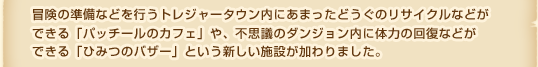 冒険の準備などを行うトレジャータウン内にあまったどうぐのリサイクルなどができる「パッチールのカフェ」や、不思議のダンジョン内に体力の回復などができる「ひみつのバザー」という新しい施設が加わりました。