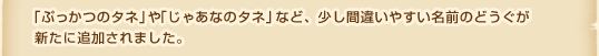 「ぷっかつのタネ」や「じゃあなのタネ」など、少し間違いやすい名前のどうぐが新たに追加されました。