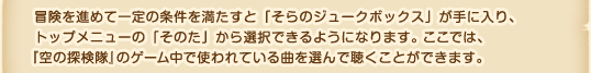 冒険を進めて一定の条件を満たすと「そらのジュークボックス」が手に入り、トップメニューの「そのた」から選択できるようになります。ここでは、『空の探検隊』のゲーム中で使われている曲を選んで聴くことができます。
