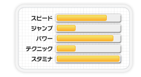 スペシャルアクション:ヘッドスライディング(ダッシュ系)豪快なヘッドスライディングで加速します。/ガム風船(ジャンプ系)口先にガム風船が広がり、浮遊します。/ハンマーシュート(アイスホッケー)ジャンプして、両手でスティックを持ち力強いシュートを放ちます。