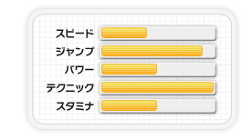 スペシャルアクション:スクリューダッシュ(ダッシュ系)竜巻の力を使って加速します。/エアスイミング(ジャンプ系)何もない空中を必死に泳いで飛距離を伸ばします。/フェイクシュート(アイスホッケー)ダンスのステップを踏みながらシュートします。
