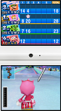 ストーンを投げて、たおしたクリボーの数を競います。全部のクリボーをたおしてストライクをねらうことはもちろん、投げたストーンが大きくなる巨大キノコや、くぐると得点が2倍になるゲートなどもうまく左右にコントロールしてねらっていきます。