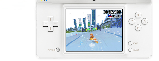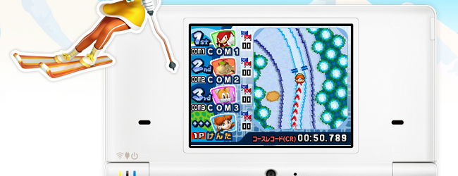 左右の旗の間(旗門)を通り抜けて、ゴールまでのタイムを競います。選手の左右をタッチして、左や右にコントロール。下にスライドすれば加速することができます。旗門を通れないと+3秒のペナルティ!うまく操作しながらより短いタイムへと挑戦していきます。