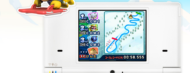 ソリにうつぶせに乗ってゴールまでのタイムを競います。助走で勢いをつけて、くねくねと曲がったコースを左や右にコントロールしていきます。ぶつからないようにうまく滑ればパワーがたまり加速することができます。