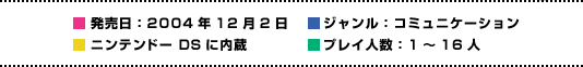 発売日:2004年12月2日/ジャンル:コミュニケーション/ニンテンドー DSに内蔵/プレイ人数:1〜16人