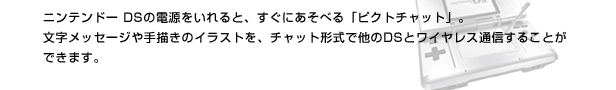 DSの特徴の一つであるタッチスクリーンを利用して、自由に描いた絵や文字を送受信してチャットを楽しむことができます。他の人が書いたメッセージをコピーして、書き加えたり、書き換えたりしたものを送信することもできます。