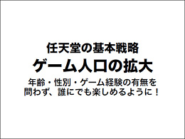 | 過去2年に渡り、私は、「任天堂の基本戦略は、年齢・性別・ゲーム経験の有無を問わず、誰もが楽しめるような商品を提案することで、ゲーム人口を拡大することである」と繰り返しお伝えしてきました。そして、その目標のもとに私たちが発売した最初のゲーム機が、 |