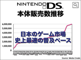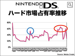 これは、メディアクリエイトさんのデータから、日本のビデオゲーム市場において、ハード全体の市場の中でのDSハードの占める割合の推移です。昨年2月、3月と、少し普及ペースが落ち、DSの存在感が弱まった時期がありましたが、昨年4月の「nintendogs」の発売以降、コンスタントにビデオゲームハードのNo.1として普及が進んできたことがわかります。