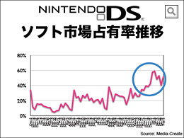 これは、日本のビデオゲーム市場全体のソフト販売数の中で、DS用ソフトの占める割合の推移です。