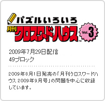 パズルいろいろ 月刊クロスワードハウスVol.3 2009年7月29日配信 49ブロック使用 2009年8月1日発売の「月刊クロスワードハウス 2009年9月号」の問題を中心に収録しています。 パズルいろいろ 月刊クロスワードハウスVol.2 2009年7月1日配信 49ブロック使用 2009年7月1日発売の「月刊クロスワードハウス 2009年8月号」の問題を中心に収録しています。 パズルいろいろ 月刊クロスワードハウスVol.1 2009年5月27日配信 49ブロック使用 2009年6月2日発売の「月刊クロスワードハウス 2009年7月号」の問題を中心に収録しています。