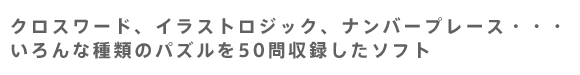 クロスワード、イラストロジック、ナンバープレース・・・いろんな種類のパズルを50問収録したソフト