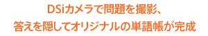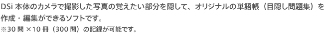 - 普段使っているノートや教科書などから、覚えたいポイントだけDSiカメラで撮影すると写真単語帳として持ち歩くことができます。例えば、新学期でクラスメートや先生の顔写真とお名前を覚えたり、動物や植物の名前を覚えるときにも便利です。