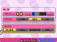プレイの開始前にスタート時のウイルスの多さやカプセルの落ちるスピード、 BGMなどを選択することができます。