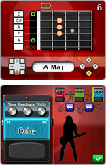 誰でも手軽に高音質なエレキギターサウンドを体感できる楽器シミュレーターです。「ディストーション」「ディレイ」「フランジャー」の3種類のエフェクターを搭載し、気軽に本格的なエレキギターの演奏が楽しめます。900種類以上もの実際のギターコードを収録していますので、ギターコードブックとして活用することもできます。プレイヤーは下画面に表示された6つの弦をタッチすることでギターをプレイします。速く弾いたり遅く弾いたりすることによって音に強弱をつけることもできます。コード(和音)内の音をランダムに再生するオートアルペジオ機能も搭載! エレキギターのプレイ経験者はもちろんのこと、未経験者にも簡単にエレキギター演奏を楽しんでいただけるソフトです。