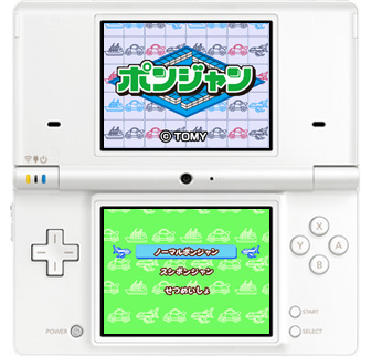 麻雀のルールをシンプルにアレンジしたテーブルゲーム「ポンジャン」がニンテンドーDSiウェアで登場。ルールは参加プレイヤーが順に9つの手牌の1つを山にある牌と交換していくだけ。先に同じ3枚の牌からなる「セット」を3つ揃えたプレイヤーがあがりになる。ソフトを購入したニンテンドーDSiシリーズ本体と人数分のDSシリーズ本体があれば、DSダウンロードプレイで、最大4人で同時対局ができます。
