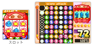 決められた時間内でどれだけたくさんのスコアを稼げるか、 挑戦するモードです。このモードでは、5チェイン以上つなげると 残り時間の減少が止まります。 さらにチェイン終了後に発生するスロットで、 同じ絵柄が3つそろうと「フィーバータイム」が発生。 一定時間消したときのスコアが倍になります。 (絵柄によって倍率が変わります) また「フィーバータイム」中にたくさんチェインを つなげると残り時間が回復します。