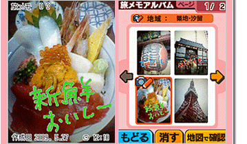 完成した写真を「旅メモ」としてアルバムに保存。旅行の思い出が、あなたのニンテンドーDSiにたまっていきます。 地図に貼り付ければ、どこで撮った写真かも一目瞭然です。
