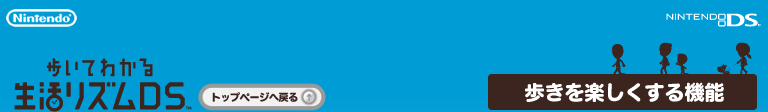 NINTENDO DS トップページへ戻る Nintendo よくあるご質問 生活リズムDSかんたんガイド 歩いてつくる世界地図 リズムにあわせてライトアップ みんなのランキング 世界ランキング 宇宙旅行