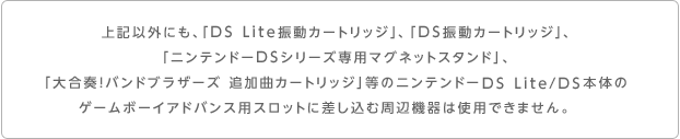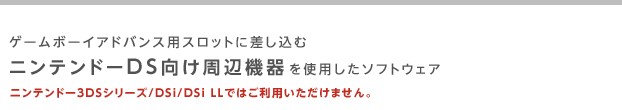 Newニンテンドー3DS/New 3DS LL/3DS/3DS LL/2DS/DSi/DSi LLでは、ゲームボーイアドバンス用ソフトはお使いいただけません。また、ゲームボーイアドバンス用スロットに差し込むニンテンドーDS向け周辺機器や、ゲームボーイアドバンスカートリッジとの連動機能は使用できません。なお、Newニンテンドー3DS/New 3DS LLでは、ニンテンドー3DS/3DS LL/2DS/DSi/DSi LLとゲームカードスロットの位置が異なるため、一部のソフトが非対応となります。