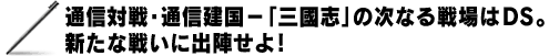 『三國志DS』は、2〜3世紀の中国における魏・呉・蜀三国時代を舞台にした歴史シミュレーションゲーム。プレイヤーは、君主の一人となって中国の統一をめざします。