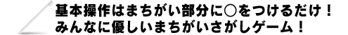 ニンテンドーDSの上下画面を見比べて、まちがいポイントをタッチペンで丸く囲むだけの簡単操作で、園児からお年寄りまで幅広い年齢層に遊んで頂けるゲームです。