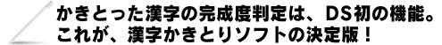かきとった漢字の完成度判定は、DS初の機能。漢字かきとりソフトの決定版!小学校で習う1,006字の漢字を、「はね」「まがり」「交差」やへん・つくりのバランスなど、小学校の「書写」にもとづき丁寧に診断します。一字一字の細部にわたり、正しい漢字を書き取ることにこだわった漢字学習ソフトです。