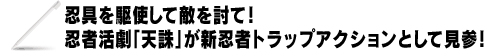 これまでの天誅シリーズの「忍んで一撃必殺」というスタイルを一新し、今作は忍具(トラップ)に主眼を置いた、全く新しいスタイルの忍者トラップアクションです。敵に気づかれないようにこっそり忍んでトラップを仕掛け、敵を追い込んで倒します。