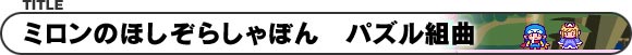 迷宮組曲の主人公「ミロン」が、DS用パズルソフトに登場だ。しゃぼんの色を切り替えて発射し、上から降ってくる同じ色のシャボンにくっつけて消していくとても簡単なルール。すべての操作をタッチペンを使っておこなうDSならではの操作感覚も面白い。時間を気にしながらハラハラドキドキのタイムアタックモードや、パズル性が高く、1個のシャボンですべてを消すと、爽快感抜群のパズルモードがある。