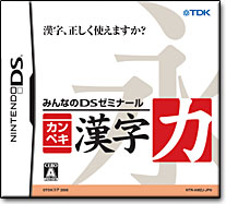 『みんなのDSゼミナール カンペキ漢字力』は、常用漢字1945文字を、しっかり身につけることができる漢字トレーニングソフト。「読み」「書き」「熟語」「四字熟語」「部首」「画数」「同音(訓)異義語」「熟語の構成」「類義語・対義語」など、漢字を身につけるのに欠かせない要素を完全網羅!収録問題数は30,000問以上!しかも、単調なドリルだけではなく、継続することが楽しくなる時代劇アドベンチャーゲームや漢字パズルゲームも充実!手書きの漢字から検索できる辞書機能、自分の漢字力を測る実力診断機能もあり、漢字の学習はこれ1本で、まさにカンペキ! |