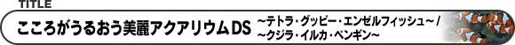 ニンテンドーDSが水槽にはやがわり!サンゴや水草など、さまざまなアイテムを使って水槽内を自分の好みにレイアウト。水槽内の温度や水質、魚の体調などにも十分注意して、棲みやすい環境をつくりだしましょう。 「〜テトラ・グッピー・エンゼルフィッシュ〜」では主に観賞魚が、「〜クジラ・イルカ・ペンギン〜」では、普段飼うことの難しい海洋生物の飼育が手軽に楽しめます。ワイヤレス通信を使えば魚の交換も可能。実際にはありえない、グッピーとクジラの混泳なんていうのも見ることができます。