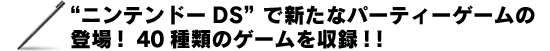 | 「THEパーティーゲーム」の醍醐味は、なんといってもみんなでワイワイ楽しむ対戦プレイ。本作では、DSカード1枚で4人までの対戦プレイでがきるので、友達や家族みんなで楽しむことができます。 |
