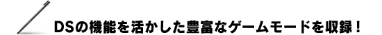 DSシリーズのTHEブロックくずし。スタンダードな「トコトンモード」では50面の完全クリアを目指したり、自動生成されるブロックを無限にくずし続けてハイスコアを目指します。しかも、自動生成されるブロックは約300万種類!その他にステージを進み、待ち構えるボスを倒す「クエストモード」、ブロックくずしの常識を覆すルールで遊ぶ「サバイバルモード」などのモードも楽しめます。更に、1カートリッジで最大8人での対戦が可能!! |