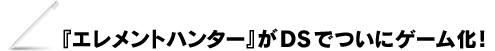 舞台は元素(エレメント)が消失しはじめた地球。プレイヤーはコロニー政府のエレメントハンターの一員になり消失した元素を取り戻すべく、地球の元素が流れ込んだ次元の壁のむこうにあるもうひとつの地球「ネガアース」でさまざまなミッションに挑む!エレメントハンターの任務は、ネガアースで地球の元素を取り込んでモンスター化した生物“QEX(キューエックス) ”を倒して、元素を回収していくこと。回収した元素を戦闘で使うと、その力を引き出し戦いを有利に進められる!そして集められる元素は100以上、その元素から生成できる武器は400以上と、コレクション要素も充実!DSワイヤレス通信を使えば最大3人でミッションに挑むこともできます! |