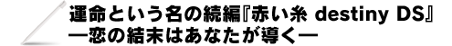 恋や友情、そして親子の愛を等身大に描いた『赤い糸 DS』シリーズ第二弾―『赤い糸 destiny DS』―。彼らの「赤い糸」をどうか見届けてください。 |