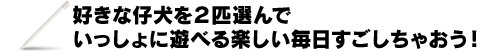 今度は2匹の仔犬を飼うことができるよ。いっしょに楽しく遊んじゃおう!同じ犬種で飼うとブリーディングもできるよ! |