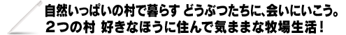 舞台となるのは、どうぶつがたくさんいる“ブルーベル村”と、作物がいっぱい育っている“このはな村”。自分好みの村で牧場生活を楽しみながら、オシャレや料理、家の模様替え、恋愛など、ほのぼの生活を満喫できます。
