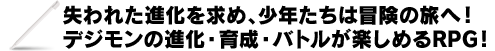 何者かの手によって進化できなくなってしまったデジモンたちと共にデジタルワールドを冒険し、失われた進化を取り戻すRPG。