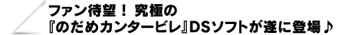 名曲に合わせてプレイするリズムアクションが楽しい!収録曲数もクイズも大ボリューム!“のだめ”の世界を楽しめるクラシックリズムアクションゲームの登場です!「コンサートホール」では、原作登場の30曲を、のだめや千秋になりきって演奏する事ができます。「ミュージックサロン」には、原作に登場した180曲以上の名曲を収録!キャラクターやシーン等で簡単検索が可能です。「マイルーム」では自分だけのアルバムを作ることができ、その上、作ったアルバムや、ミュージックサロンに収録されている曲は、DSを閉じたままでも再生可能!ヘッドフォンでミュージックプレーヤーのように楽しめます!650問以上収録のクイズカフェ等、他にも楽しい要素を収録! |
