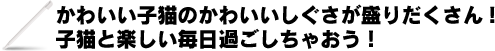 その他にも、子猫のかわいいトレーディングカード「にゃんトレカ」や、部屋に置くと子猫がかわいいリアクションを見せてくれるアイテムなど、楽しい要素がいっぱい!
