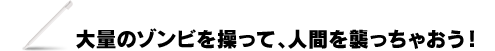 昨今では敵キャラクターの代表格となったゾンビを味方にして人間と戦うという、クスリと笑いがこぼれるようなアンチテーゼにご注目ください! |