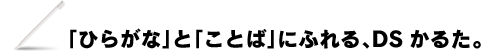 『カードであそぶ!はじめてのDS』は、「あ」〜「ん」までのひらがなが書かれた46枚のかるたカードと、DSを使って”ことばあそび”ができるゲームです。