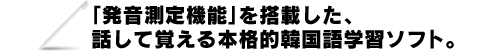 DSで学べる本格的韓国語学習ソフト。最大の特長はDS内蔵マイクに向かって話しながら発音練習ができる「発音測定機能」の搭載です。自分の声を録音し、波形グラフで表示、お手本と比べながら練習できます。もちろん内容も充実。「韓国語の基礎」「会話」「単語」と基本から応用までを収録。初心者の方でも手軽に分かりやすく取り組めます。いつでもどこでも「目で見て」「耳で聞いて」「声に出して」韓国語が学習できます。 |