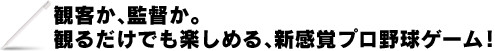 これまでのアクション性の強い野球ゲームが苦手な方でも、楽しめる簡単操作!リアルタイムで進行する試合に、気になる場面でタッチペンで選手に指示を出す!ゲームの上手・下手にかかわらず、誰でも手軽に試合の駆け引きが楽しめます!試合に勝つために必要なのはゲームの腕前ではなくて、あなたの采配次第!ペナントレースでは長期戦を乗り切るには選手登録や先発ローテーションなどの戦略も必要! |