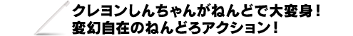人気アニメ『クレヨンしんちゃん』の横スクロールねんどろアクションゲームがニンテンドーDSに大登場!地球の地下にある「ネンドネシア」から地上ねんど化を企む侵略者が攻めてきた!フシギな少女コロンちゃんにもらったねんどの力でしんちゃんが大活躍!3つのねんどろアクションで、ねんど世界の侵略者からみんなをおまもりするのだ!